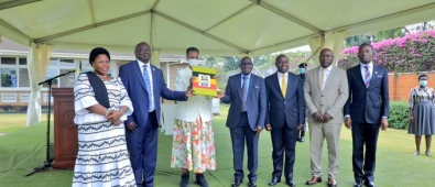 Winner of the 2019 World Population Day National Celebrations Bicycle competition receiving his prize from the 1st Deputy Prime Minister, Gen Moses Ali.